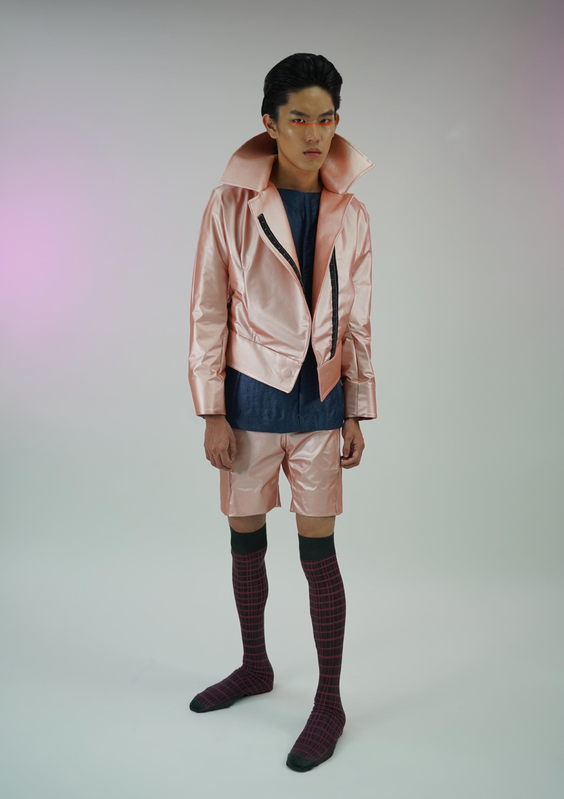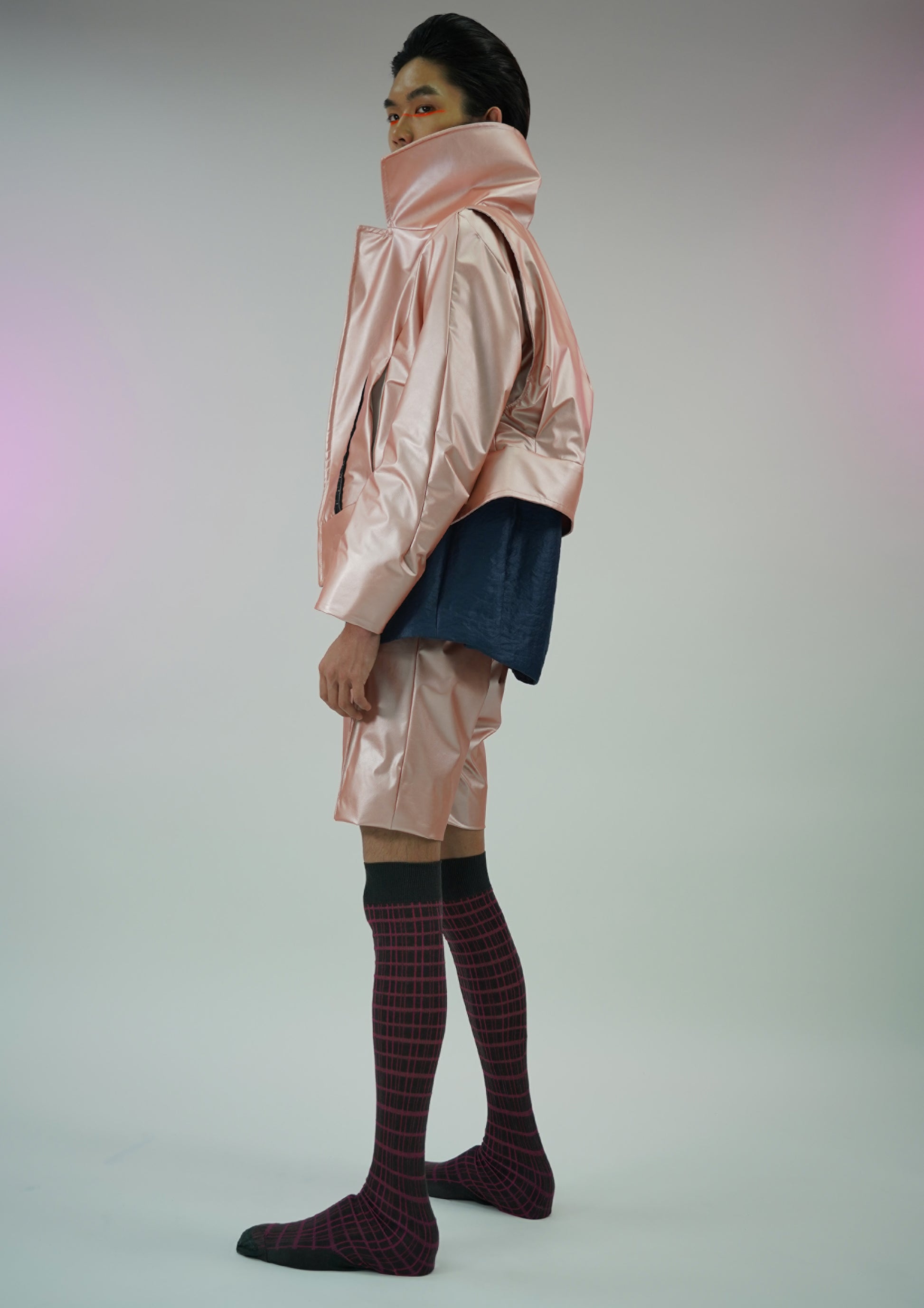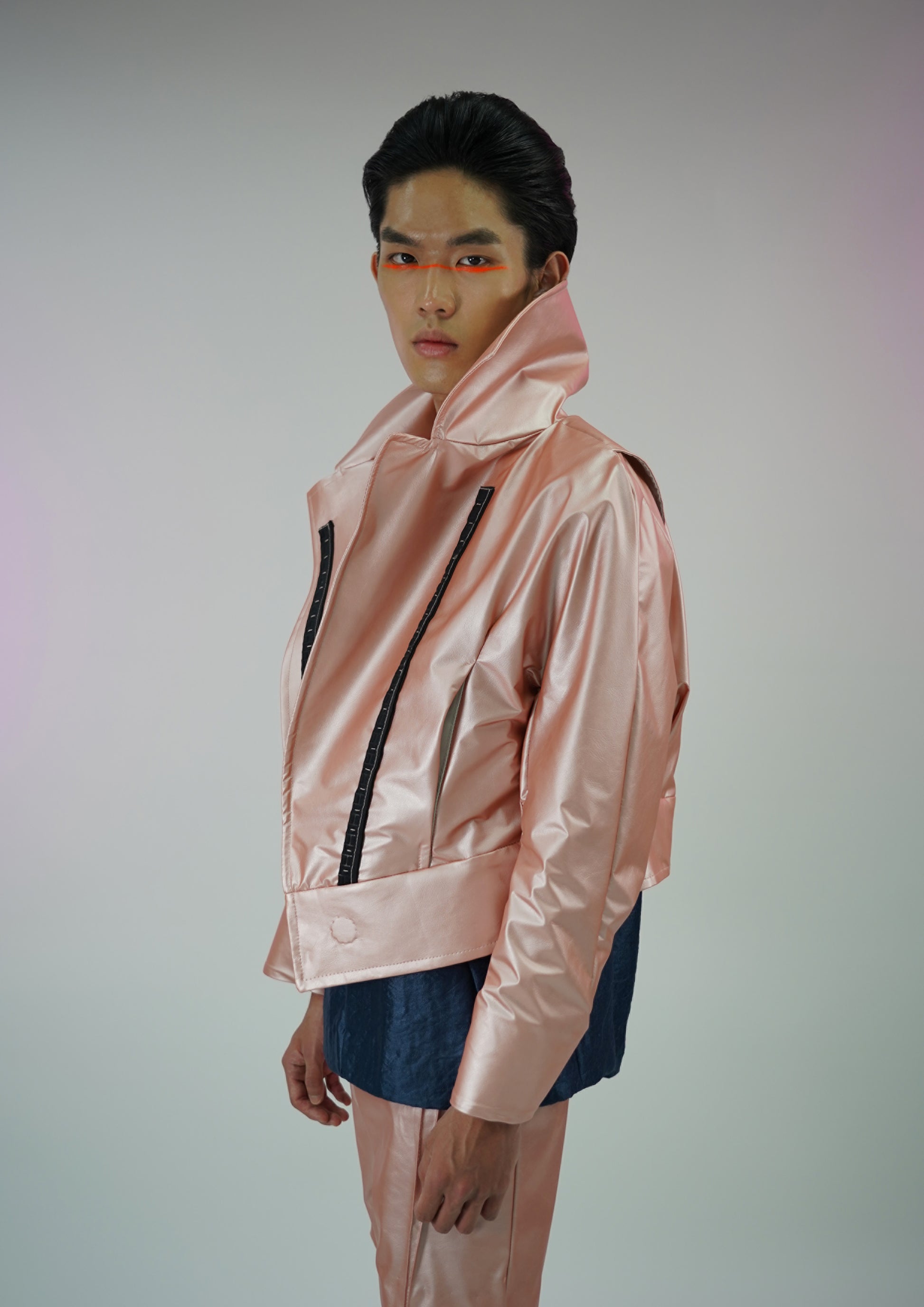 The futuristic leatherette jacket inspired by the anime Ghost In The Shell comes in a high collar, magnetic fastening strips, and concealed pockets in reptile leather texture.
